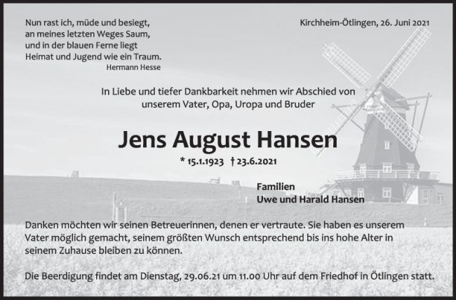Trauer Jens August Hansen