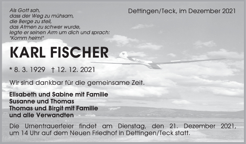 Danke Karl für Deine geduldigen Gespräche und stets freundliche Art. Danke für den respektvollen Umgang als Fliegerkamerad und kompetenter Lehrer. Dein Vorbild hat mich stets begleitet. Schade, wir konnten uns nicht mehr sehen. Sicherlich wirst Du von da oben lächeln und in Stille beobachten, wie der Teckhang geschrubbt wird.