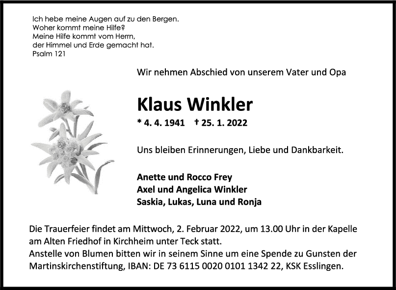 Es tut mir leid vom Tod von Klaus Winkler zu hören. Ich trauere mit der Familie.