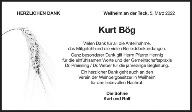 Danksagung Kurt Bög
