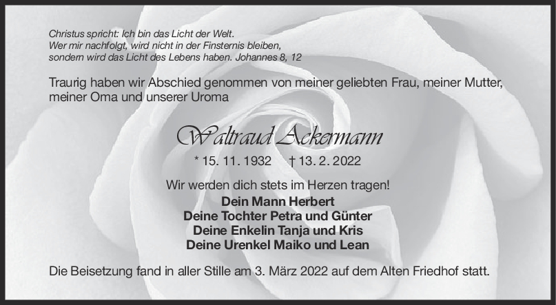 Gedanken an einen lieben Menschen der von uns gegangen ist begleiten mich in dieser Zeit . Meine liebe Schwester Waltraud :Du bist all dehnen jetzt gefolgt die uns vorher verließen und die Dich auf einem Teil Deines Weg durchs Leben begleitet haben. Wir , die Hinterbliebenen trauern um Dich, Du hast eine Lücke hinterlassen die wir nicht auffüllen können. Umso mehr werden wir an Dich denken . Waltraud wir vermissen Dich , wir behalten Dich in unserem Herzen bis wir einst Dir folgen werden.