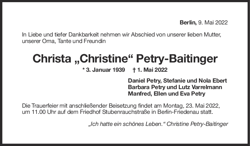 Christine und ich waren seit einem Krankenhausaufenthalt miteinander im Kontakt. Ich mochte Ihre Mutter sehr gerne und habe sie gelegentlich mal besucht. Als sie auf meine Nachrichten nicht mehr antwortete, habe ich schon befürchtet, dass es ihr nicht gut ging aber erst heute bin ich auf die Idee gekommen, zu googeln und bin auf diese Seite gekommen. Der Tod Ihrer Mutter ist inzwischen eine Weile her, aber hat mich dennoch sehr betrübt. In meinen Erinnerungen wird sie immer weiter leben als die herzliche, offene und lebenslustige Frau, die allen Unbilden getrotzt hat und das Schöne und Gute im Leben gesehen hat. Jetzt ist sie mit ihrem Friedrich vereint, den sie so sehr vermisst hat; das tröstet mich etwas.