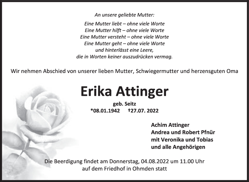 Mein aufrichtiges Beileid zum Tode Eurer lieben Mutter. Für Erika war es bestimmt eine Erlösung, für Euch ist es nicht einfach wenn man die Mama verliert.