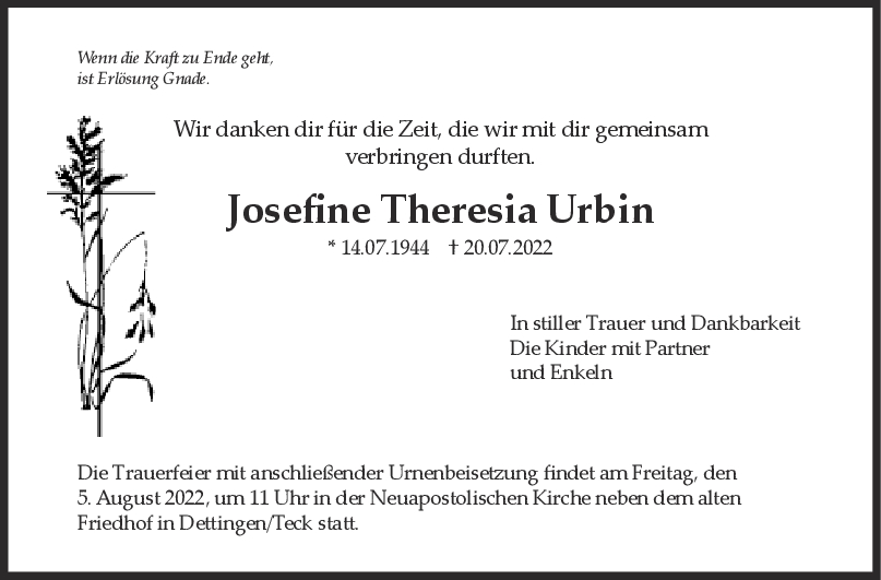 1. Herzliches Beileid.Sie war eine langjährige nette angenehme Kundin.Das Essen auf Räder Team St.Hedwig Kirchheim