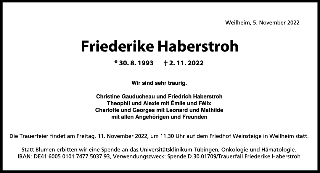 2. Ich habe Friederike als unglaublich sympathische, fröhliche und vor allem als sehr kompetente Kollegin in Erinnerung. Diese Nachricht hat mich erschüttert und ich bin unendlich traurig. Ich werde sie vermissen. Mein herzlichstes Beileid an die Familie und alle Freunde. Viel Kraft in diesen schweren Stunden.