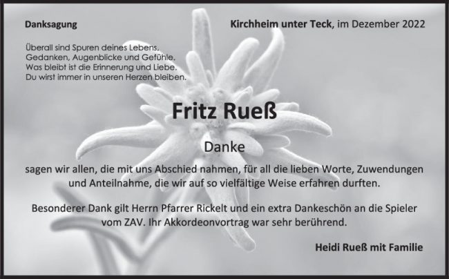 Danksagung Fritz Rueß