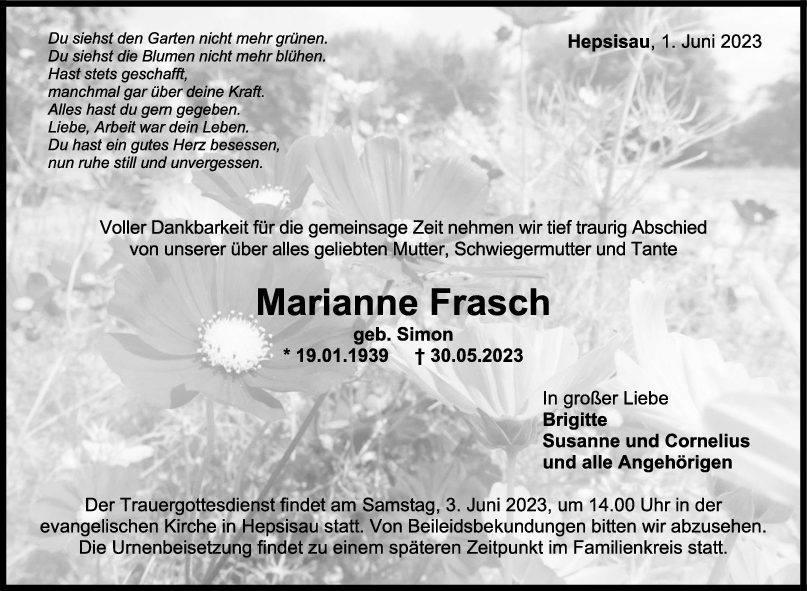 meine aufrichtige und tiefe Anteilnahme für Eure Mutter Marianne.