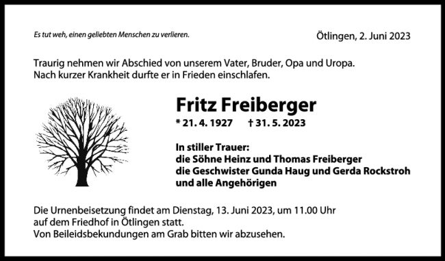 Trauer Fritz Freiberger 07/06/2023