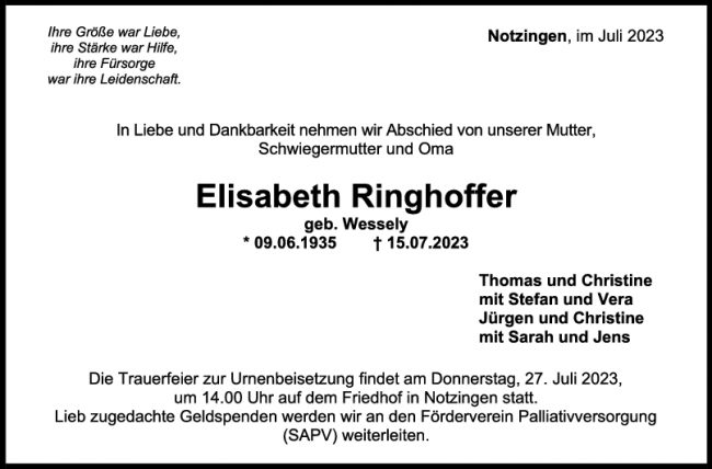 Trauer Elisabeth Ringhoffer 22/07/2023