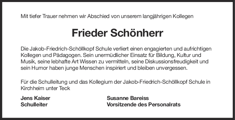 Ich habe Frieder Schönherr, als einen tollen, erfahrenen, aufrichtigen und engagierten Lehrer und Freund kennengelernt. Er hat einen immer und überall wo er konnte unterstützt. Ich konnte mich bei jeglichen Fragen, egal ob es um den Musikunterricht, den Lehrerberuf, das Leben, Musik oder jedes andere Thema, an ihn wenden.