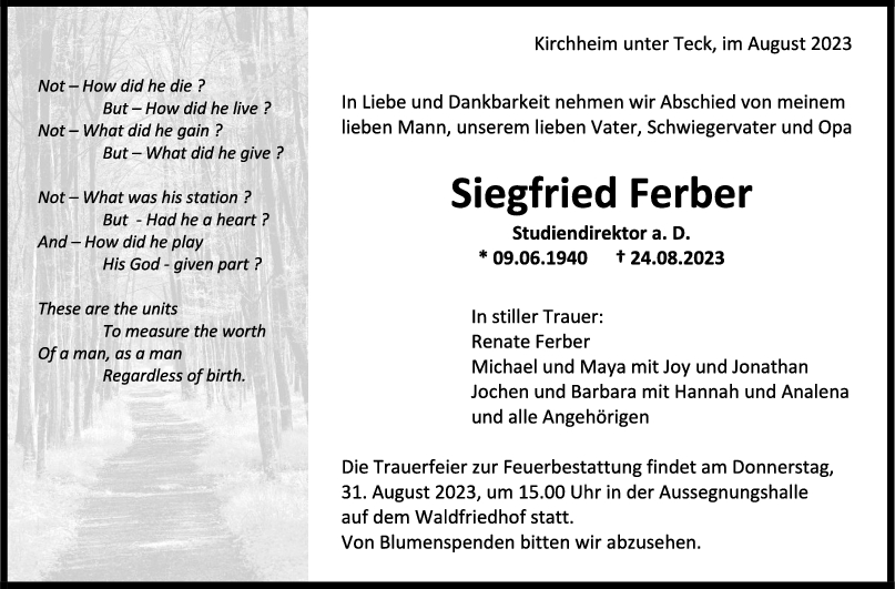 Ich hatte Herrn Ferber in der 5. und 6. Klasse (seit 1979) in Englisch. Ich bin heute noch erstaunt, wie viel aus dem Englischunterricht aus dieser Zeit – fast 45 Jahre später – noch präsent ist. Meine aufrichtige Anteilnahme!