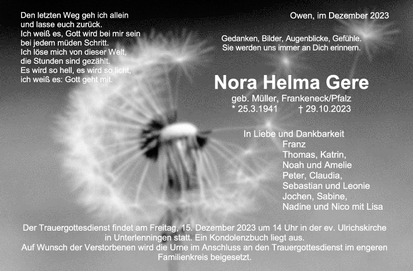 auf diesem Wege übermitteln wir Euch, unsere aufrichtige und tiefe Anteilnahme für Nora Helma Gere!