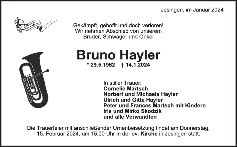 Lieber bruno, wir können es kaum glauben, das du nicht mehr unter uns bist. Lange Zeit musizierten wir in jesingen und ötlingen zusammen. Hatten viel Spaß. Du fehlst uns. Gute Reise . Roland Stifter