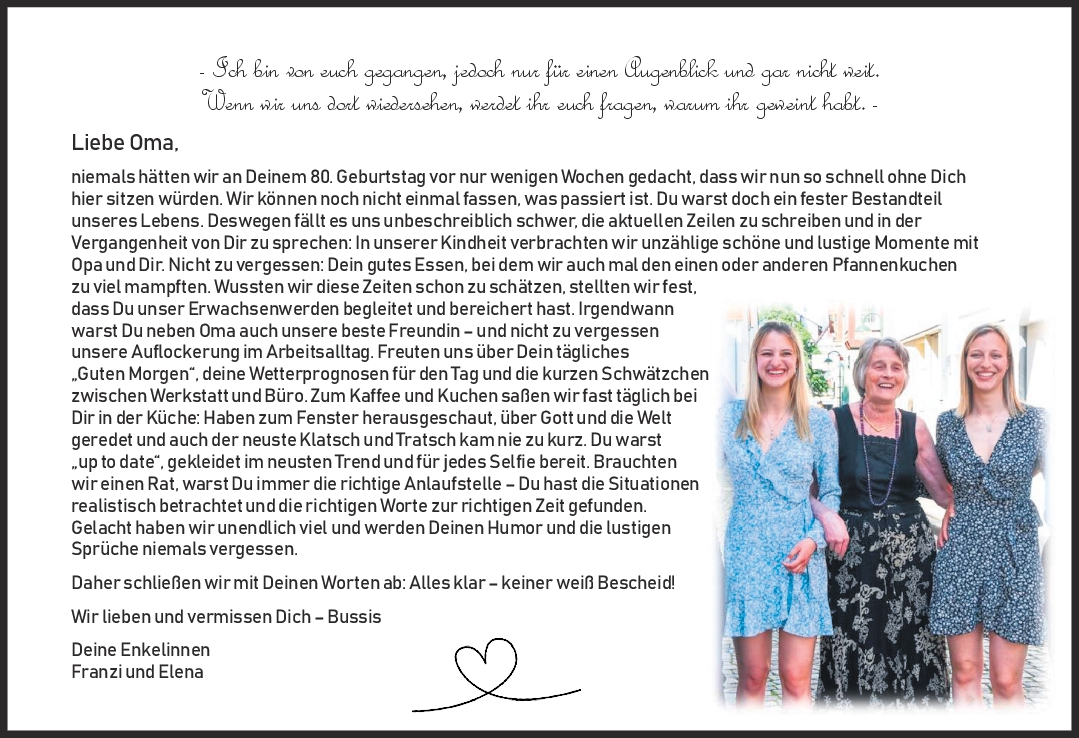 1. Liebe Franzi und liebe Elena, Eure Oma hat es bis in die Google-News geschafft, und somit auch zu uns. Euren Schmerz um den plötzlichen Verlust Eurer geliebten Oma können wir total nachvollziehen und senden Euch einen stillen Gruß und ein kleines Gebet. Ihr seht Euch wieder!!!!!