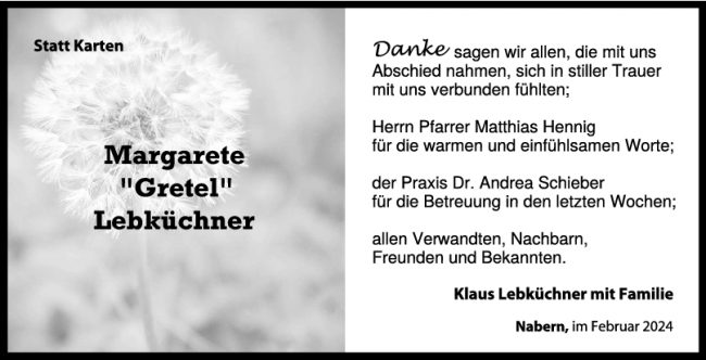 Danksagung Margarete “Gretel” Lebküchner 24/02/2024