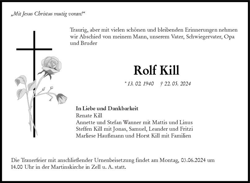 Liebe Trauernde um unseren Rolf, noch sehe ich ihn im Dorfhaus sitzen und wir reden, wie anstrengend das Leben ist. Wie immer hat Rolf rege am Geschehen teilgenommen. Ich habe zum ersten Mal Sie, liebe Marlies, kennen gelernt und ich habe mich am Mundharmonika Spiel von Horst erfreut. Ich wünsche Rolf eine gute Reise dorthin wo Jesus für uns eine Wohnung bereitet hat. Den Hinterbliebenen viel Kraft und Zuversicht.