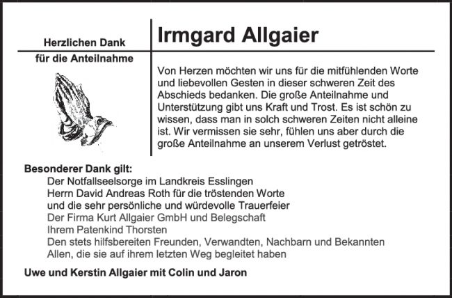 Danksagung Irmgard Allgaier