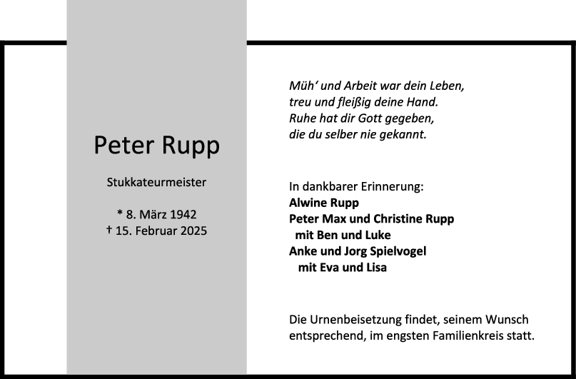 Ganz liebe Grüße der Anteilnahme von mir, auch wenn ich heute nicht bei euch im Schwabenland sein kann. Ich kann mich noch gut an Peter Rupp erinnern, seine Bodenständigkeit und sein Lachen. Haltet ihn in euren Gedanken. Gedanken füllen die Unendlichkeit.
