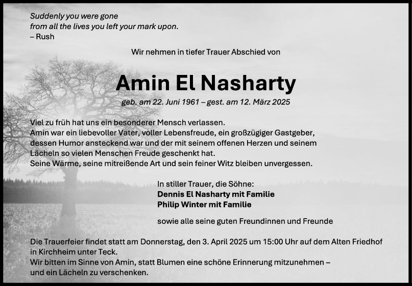 Amin mein freund kann das nicht glauben, mir fehlen die Worte ! Du fehlst mir als Nervensäge, als vertrauensvoller freund, als verbindenter Mensch, als großzügiger Geist, als Ratgeber, Spaßvogel, mein Gott was konnten wir lachen 😂. Wünsche mir noch viel drüber lachen zu können. Mir fehlt das gebrudle . Wir hätten einen Comic drehen sollen. Charakter wenn das einer hat bist du das. Was bleibt eine große Lüge. Amin.