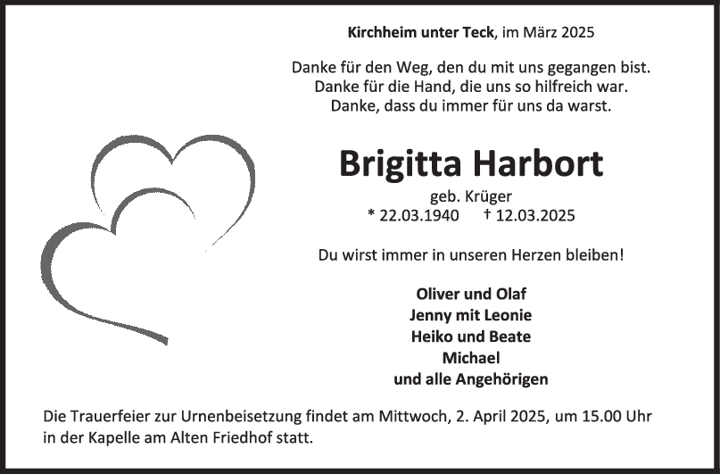 2. Hallo Oli hallo Olaf, leider ist das Kondolenzkärtchen zurück gekommen, das euch in der Kernerstrasse 12/1 in Kirchh.Ötlg nicht erreicht hat. Trotzdem möchte ich nicht versäumen, euch meine aufrichtige Anteilnahme zum Heimgang eurer Mutter auszusprechen. Ich habe sie immernoch in guter Erinnerung. Man denkt immer, eine Mamma muss einem ein Leben lang begleiten…Ganz herzliche Yvonne Vatter aus Holzmaden
