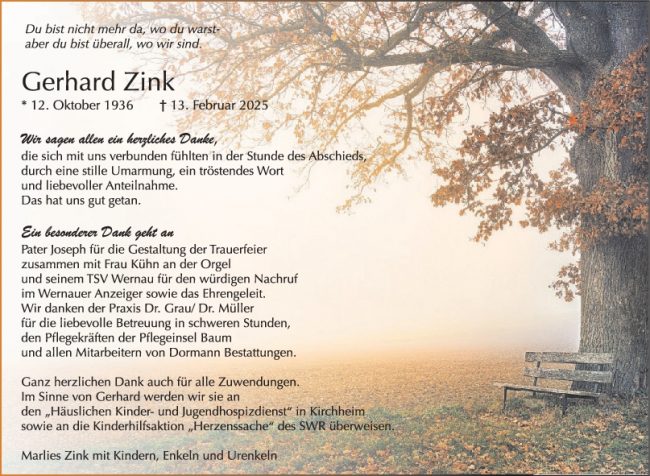 Danksagung Gerhard Zink