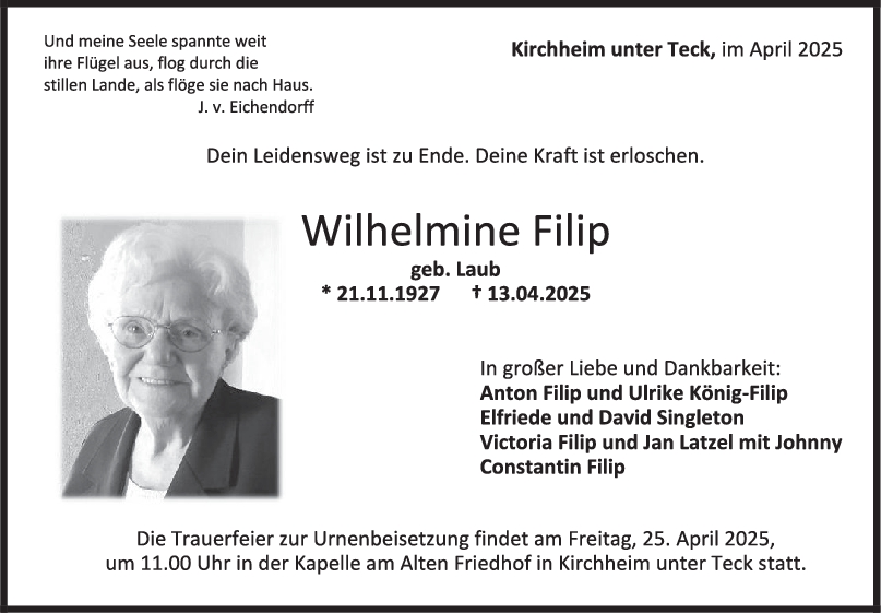 Ein ganz besonders liebes Menschenkind ist auf die letzte Reise gegangen .Tieftraurig Lore Schmid.Danke für Deine Freundschaft und dass wir Kolleginnen sein durften.Danke liebes Filiplein..Mein Beileid für die Liebe Familie,Herzlich Lore.