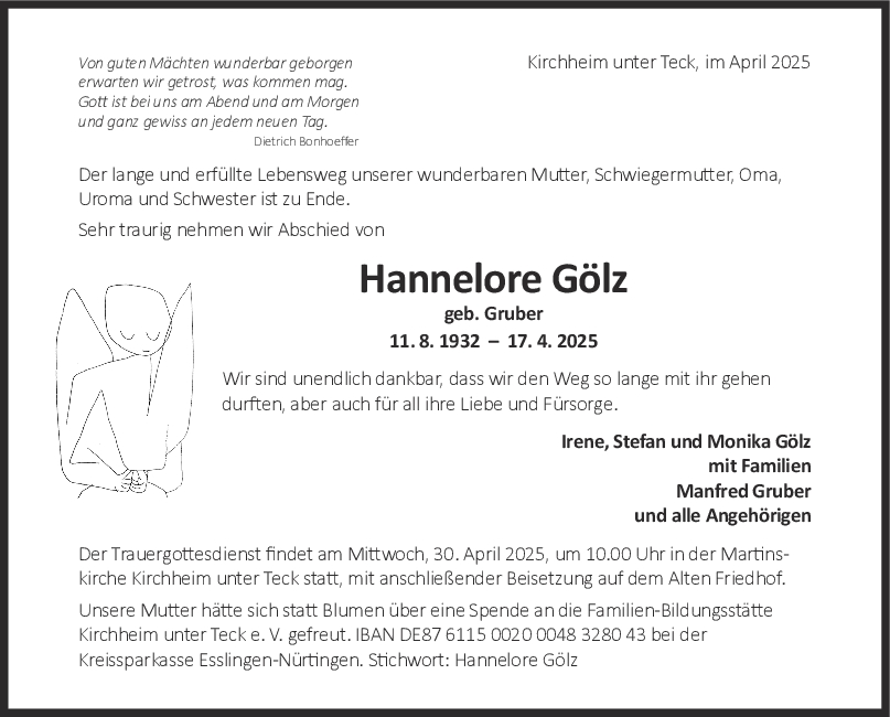 Ich werde sie in sehr guter Erinnerung behalten! Jede Begegnung war geprägt von Ihrer Freundlichkeit und ehrlichem Interesse. Zudem durfte ich als Grundschüler in Ötlingen meine ersten selbstgemachten Maultaschen bei ihr essen.
