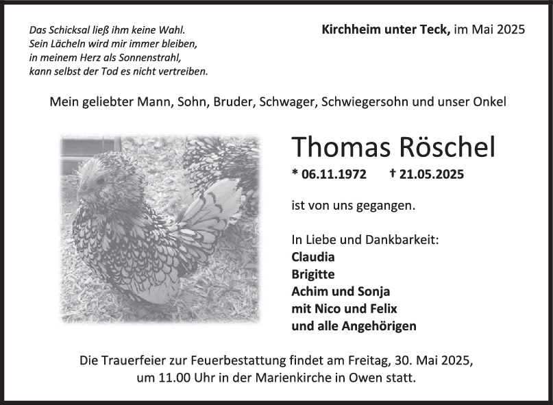 es ist mir ein großes Bedürfnis meine Anteilnahme auszusprechen. So gerne haben wir gemeinsam in Riedlingen und Owen unsere Tauben ausgestellt. Du wirst mir fehlen lieber Thomas,
