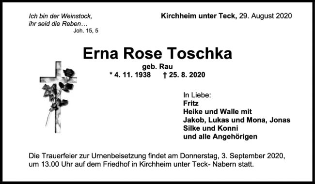 Trauer Erna Rose Toschka