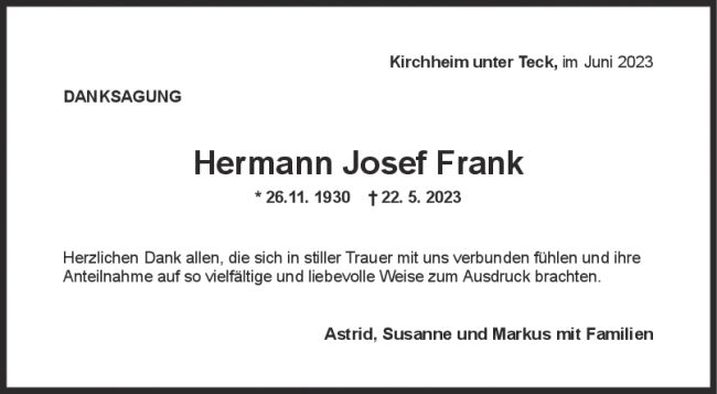 Danksagung Hermann Josef Frank