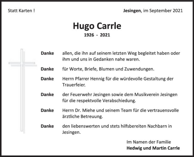 Danksagung Hugo Carrle