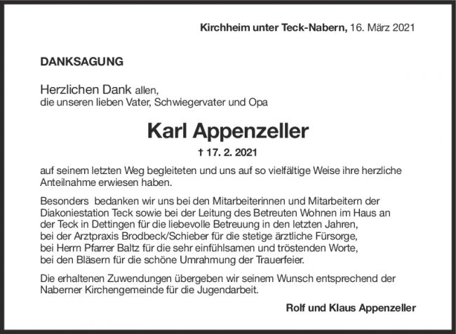 Danksagung Karl Appenzeller