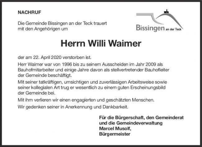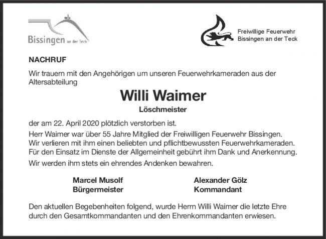 Nachruf Feuerwehrmann Hans Willi Waimer