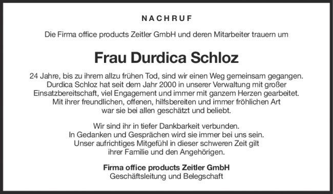 Nachruf Durdica Schloz