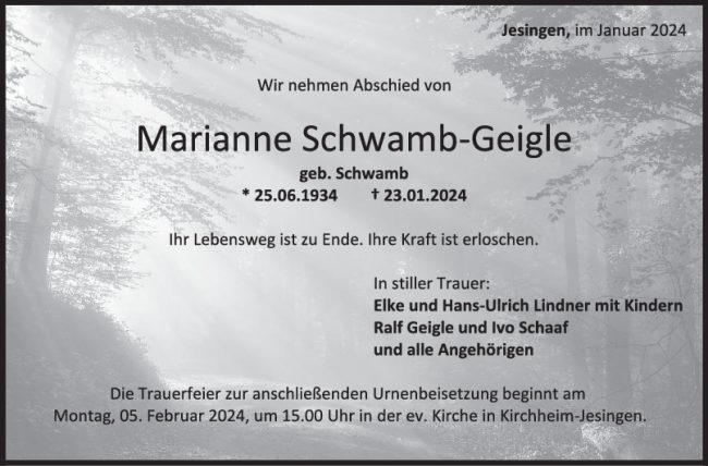 Trauer Marianne Schwamb-Geigle