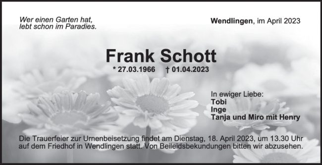 Trauer Frank Schott