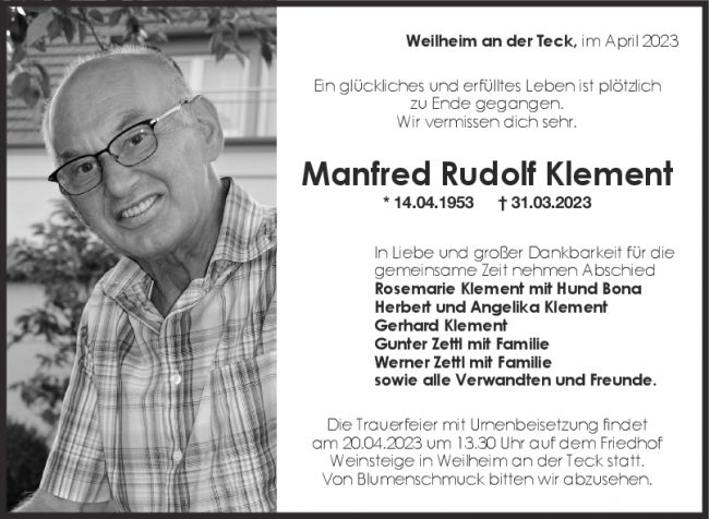 Trauer Manfred Rudolf Klement 15/04/2023