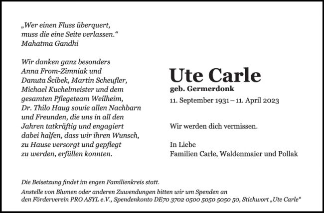 Trauer Ute Carle 15/04/2023