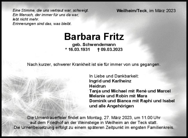Trauer Barbara Fritz 20/03/2023