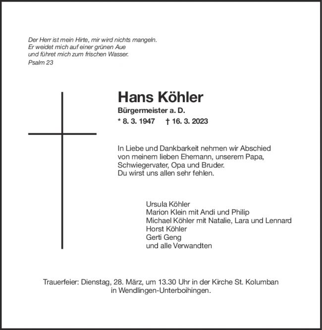 Trauer Hans Köhler
