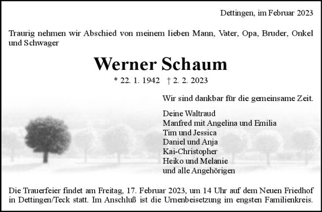 Trauer Werner Schaum 11/02/2023