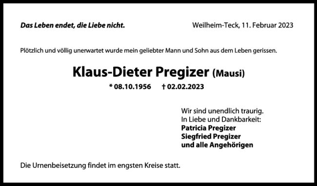 Trauer Klaus-Dieter Pregizer 11/02/2023