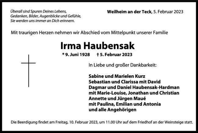 Trauer Irma Haubensak 08/02/2023