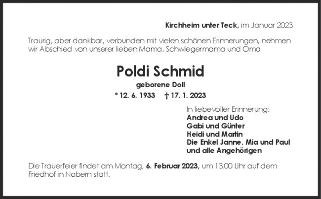 Trauer Hilde Paula Kuhnle 28/01/2023