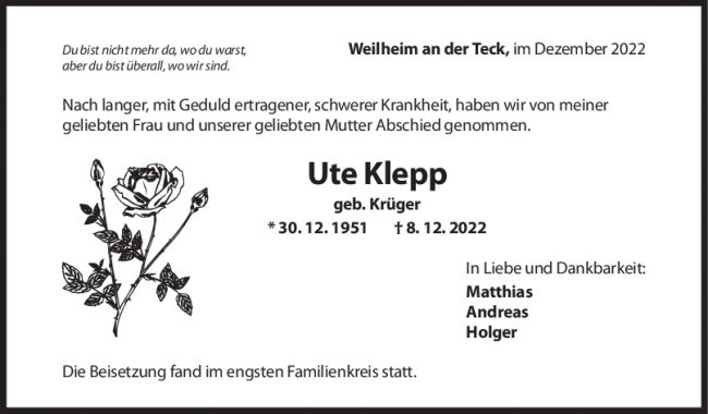 Trauer Ute Klepp 29/12/2022