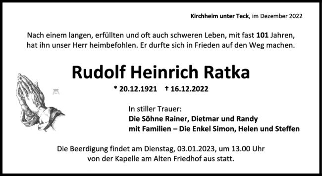 Trauer Rudolf Ratka 28/12/2022