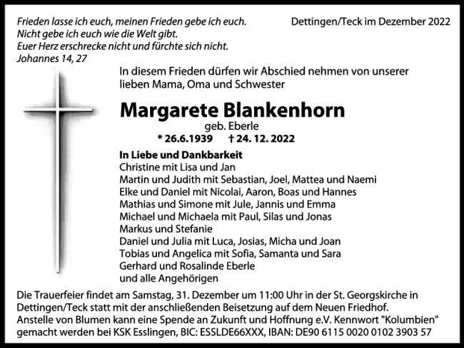 Trauer Margarete Blankenhorn 29/12/2022