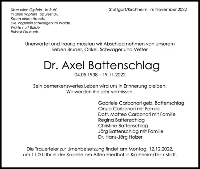 Trauer Dr. Axel Battenschlag