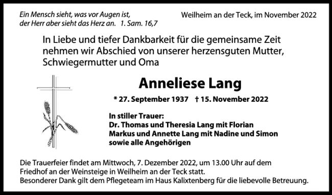 Trauer Anneliese Lang 25/11/2022