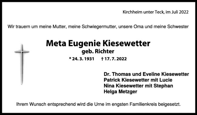 Trauer Meta Eugenie Kiesewetter 23/07/2022